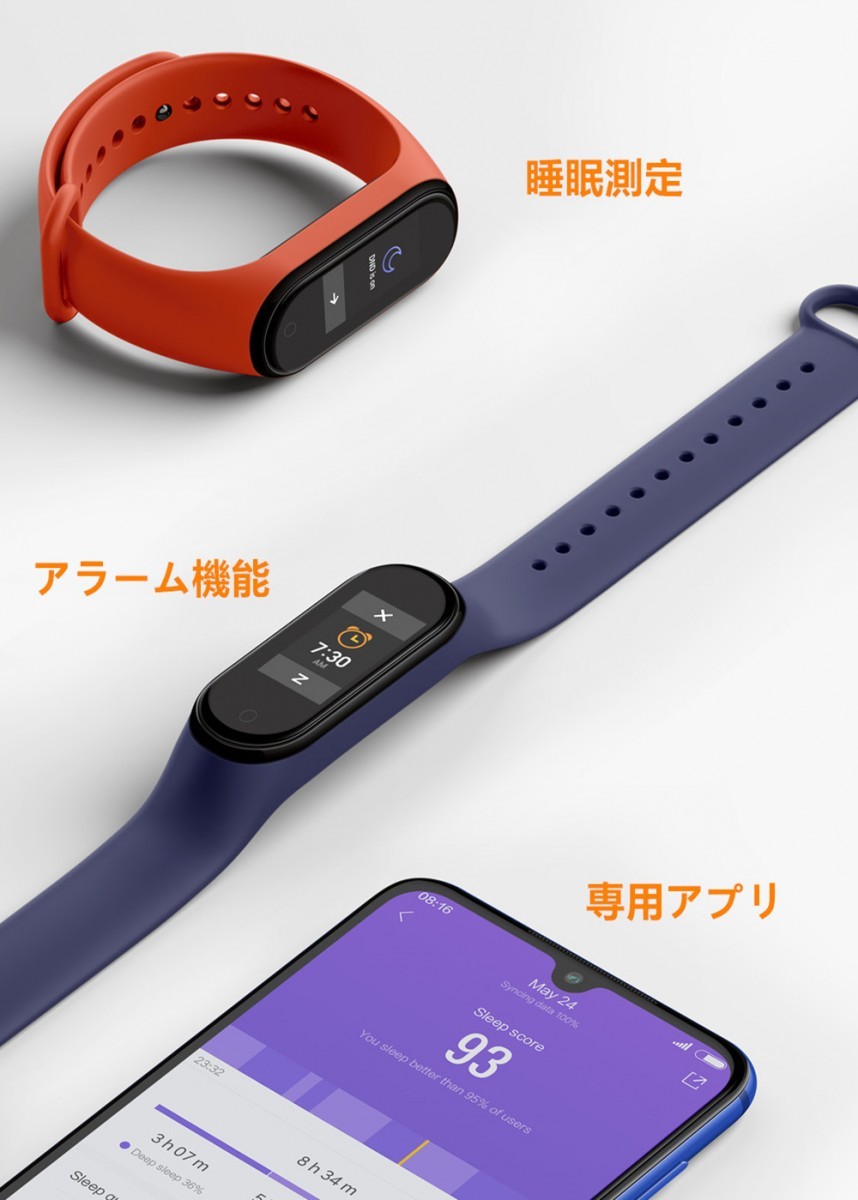 XiaomiのMi Bandとしては4代目にあたり、0.95 インチAMOLEDカラータッチスクリーン搭載です。22gという軽量で、バッテリーは20日もつというのがストロングポイントです。