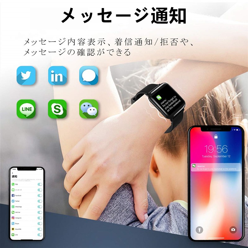 【主要機能】 ・時間や日付表示 ・歩数や距離や歩行時間・消費カロリー ・24時間心拍数・メッセージ・Line・メール(SMS)等の通知と内容表示 ・電話の着信通知と拒否 ・カメラ遠隔操作 ・運動等のデータ自動同期、運動データ分析 ・腕を傾けると自動点灯 ・タイマー機能 ・長座注意 ・スケジュール管理(目覚まし時計、誕生日、お祝いなど、時間帯で設定可能)