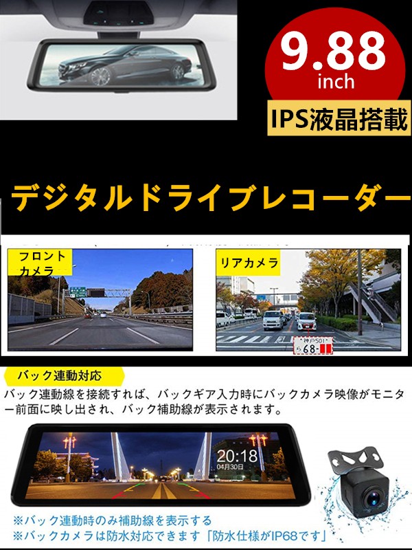 ドライブレコーダー 前後カメラ 9.88インチデジタルインナーミラー 同時録画 32GBカード付属 日本語表示