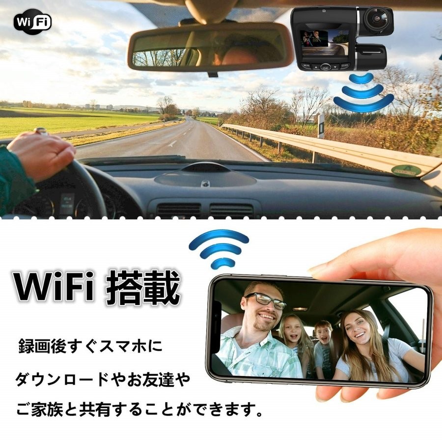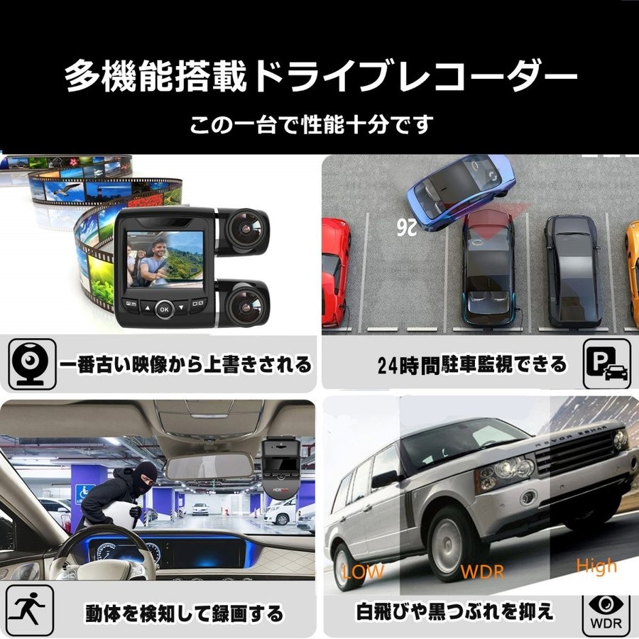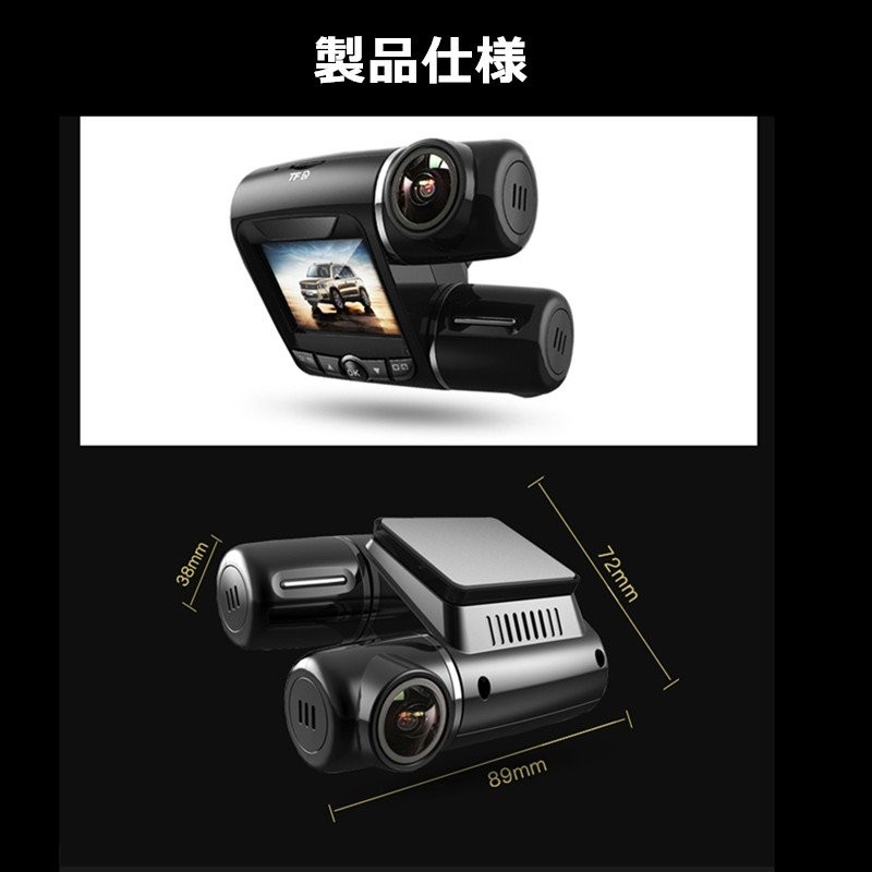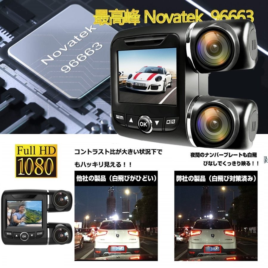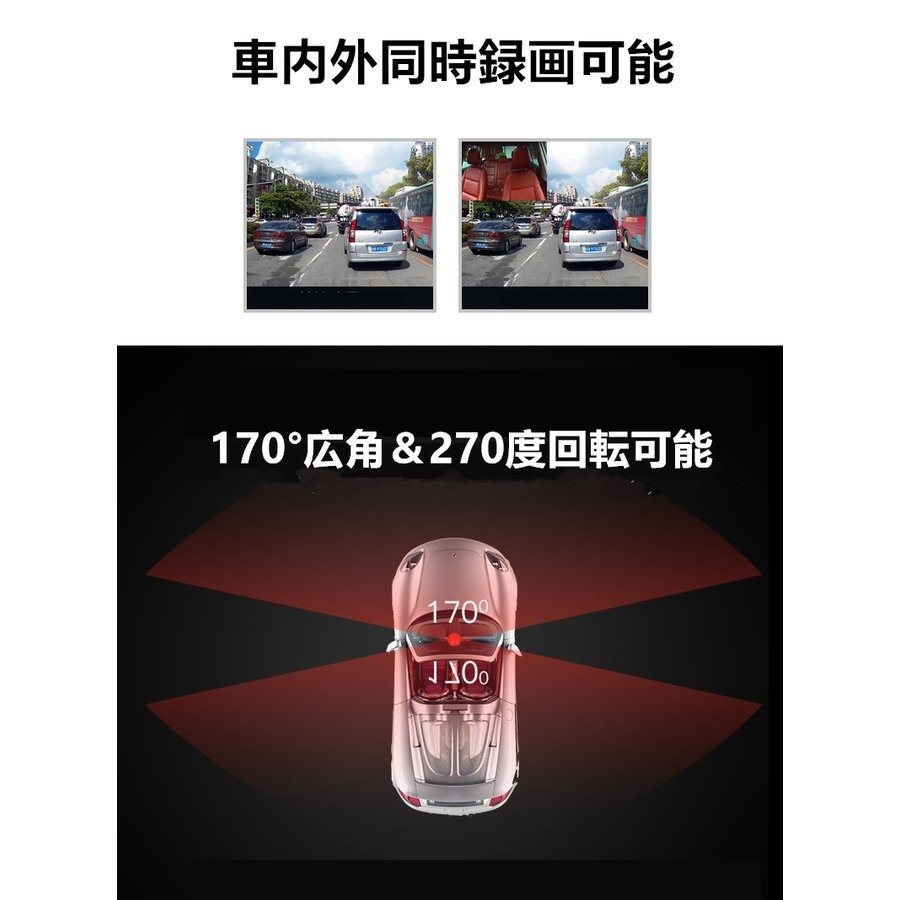【回転可ダブルカメラ】ダブルカメラ式で、駐車中で車前方の映像と車内の映像を同時に録画可能! 運転中に、車内に子供やペットがある場合や女性一人で運転する場合などは思いがけない瞬間も逃げさず録画して、運転の安全を保障する同時に、車内の安全も確認できます。 【SONY センサー&Novatekチップ採用】前後カメラとも魚眼レンズで、Novatek 96663の高配置チップ及びソニーIMX323センサーを採用しており、1920*1080pフルhdではっきりして安定で録画できます。リアカメラの映像も十分すぎるくらい鮮明で、夜間撮影には強い! 【Gセンサー・衝撃録画】車内の動き物や車前方の衝撃を検出した場合、自動的に衝撃録画データとして記録されます。 【取り付け簡単】電源ケーブルはシガーライターソケットを採用し、車輌側の改造が不要、取り付けは更に簡単です。 【安全運転支援機能搭載】車線逸脱警報機能(LDWS):走行中、車線から外れると警告音で知らせます。