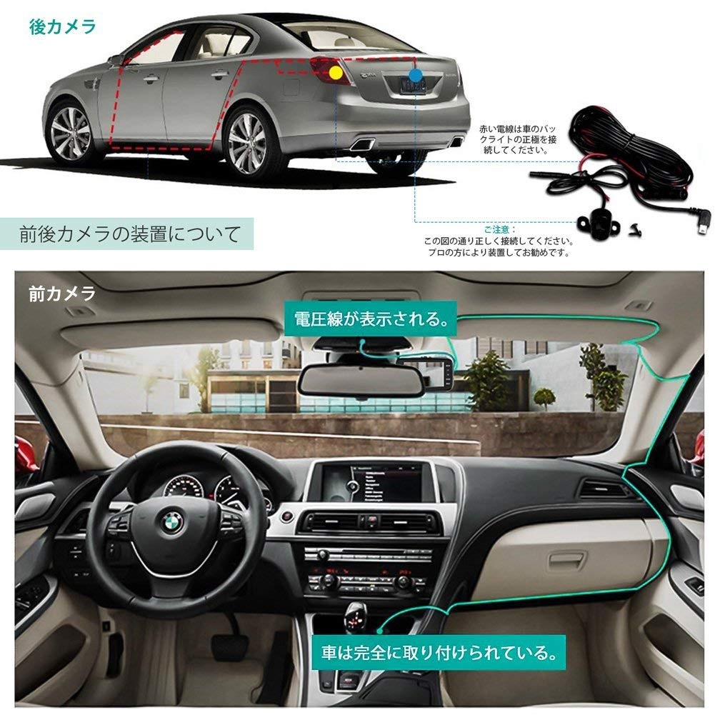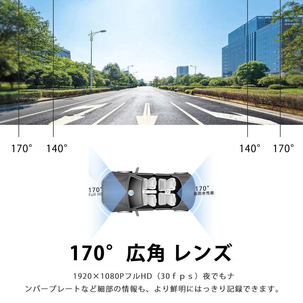 【フロントカメラ+リアカメラ】 170度広角+フルHD1920*1080P/30fpsのフロントカメラ+ 640X480リ アカメラによって、死角せず前方の状態がもちろん確認できて、後方から追突された場合もしっかり 記録できます。 視野角は広く、音声記録で事故の発生状況を客観的に判断できます。