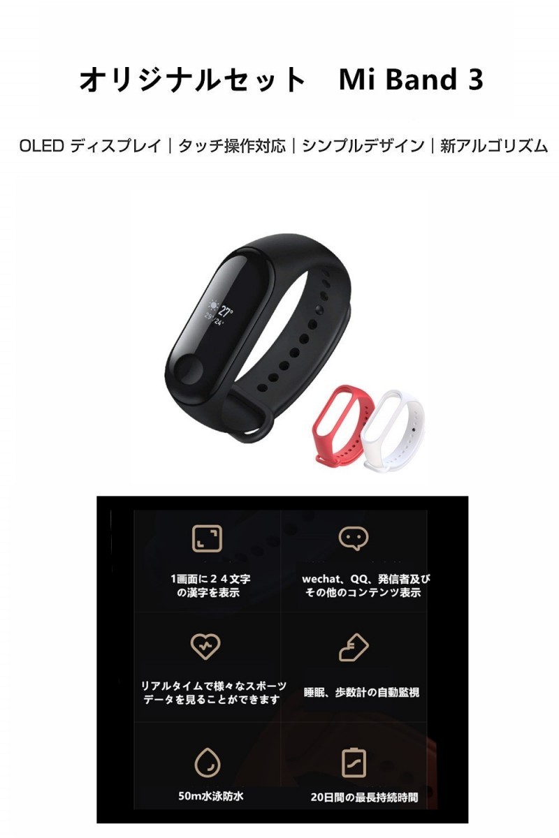 Mi Band 3 Xiaomi スマートウォッチ 活動量計 歩数計 心拍数計 睡眠モニター 消費カロリー計 (最長20日間) (ホワイトバンド・レッドバンド各1本付)