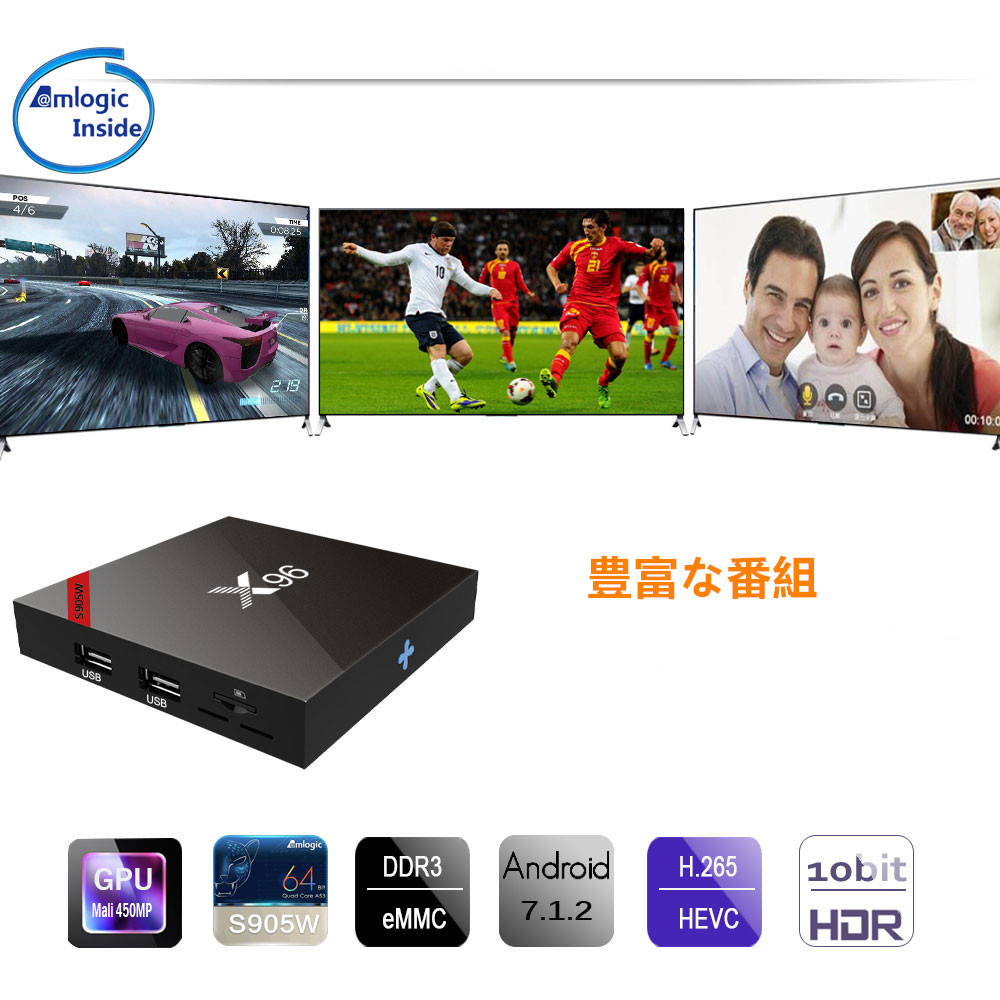 X96 Android TVボックスにはAmlogic S905W CPUとMali-450MP GPUが付属しており、ビデオを視聴したりゲームをプレイしたりするためのスムーズなエクスペリエンスを提供します。 4Kの究極のHDビデオを提供するのに最適なデバイスであり、独自のホームシアターを簡単に作成できます。 このAndroid TVボックスは、家族向けのエンターテイメントに最適です。家族で一緒にゲームをしたり、テレビ番組を見たりすることもできます。 それはTVボックス以上のものであり、あなたに素晴らしい楽しい時間を与えてくれます。 【高度な操作システム】高速で強力なAndroid 7.1.2 操作システムを採用します。Android 7.1.2には、ソフトウェア、ゲーム、アプリケーションプログラムの互換性があります。 【強力なプロセッサ】画像処理とコンピューティングで高度なAmlogic S905W CPUを搭載。Mali-450MP GPUは750MHzの速度を提供します。 【簡単で便利な使用方法】電源を接続し、ボックスをWiFiなどに接続するとすぐに、好きなものを見ることができます。ユーザーはブラウザーでインターネットをサーフィンし、YouTube、Skypeビデオ通話、MSN、Facebookなどの種類のアプリを通して世界中と通信します。また、ホットフィルムやテレビ番組はいつでも検索できます。 【実用的なマルチメディアプレーヤー】実用的なホームストリーミングメディアプレーヤーで、お気に入りの映画、スポーツ番組、エンターテイメントプログラムを自由に視聴できます。また、16 GBのストレージを活用するだけで、好きなゲーム、映画、テレビ番組を保存できます。 ※注:IOS12.0以上のエアプレイ機能をサポートしないでください。